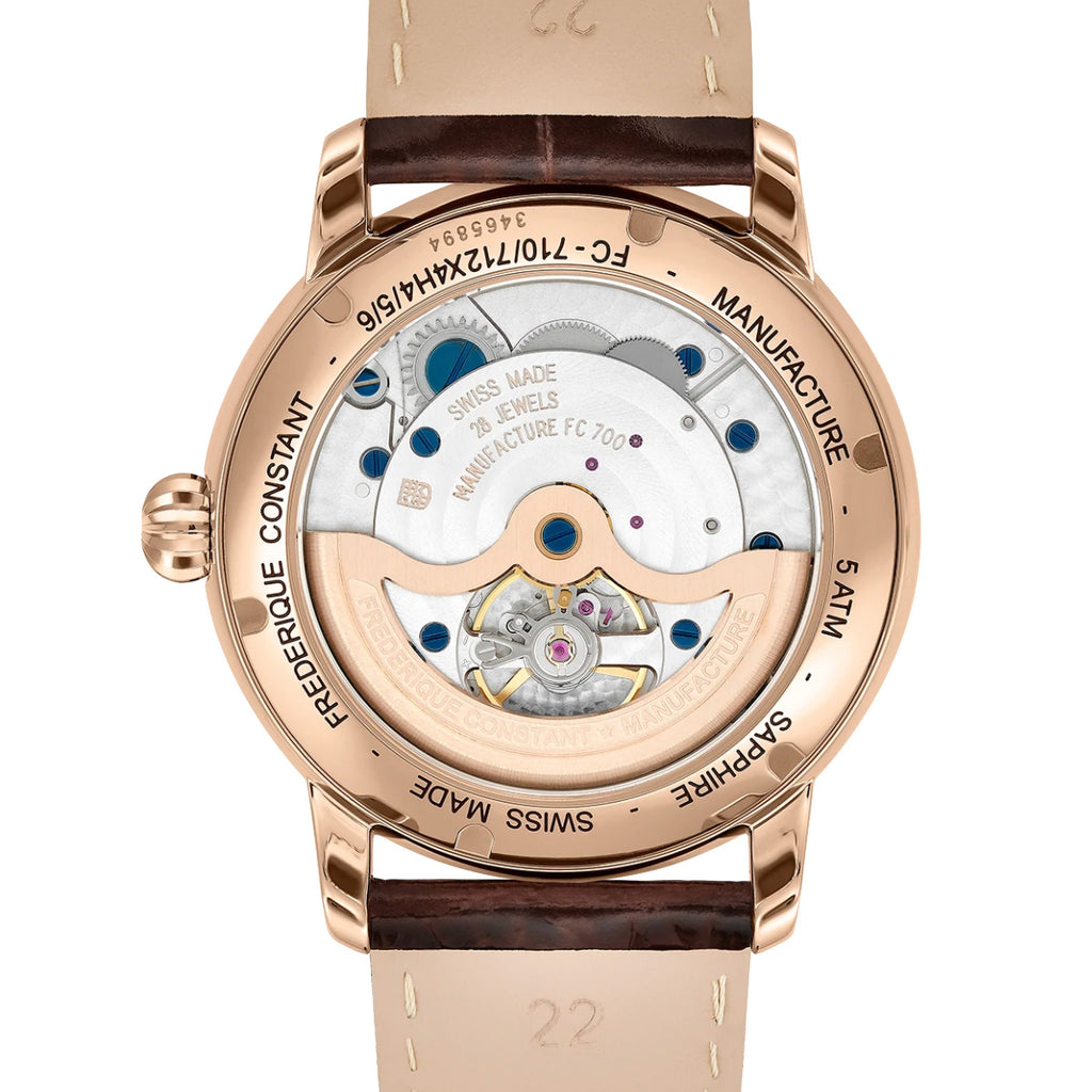 Crafted in harmony with the finest watchmaking traditions, the Classics Moonphase Manufacture comes in a balanced 42 mm case diameter and housing the FC-712 movement, in-house designed, produced, and assembled.