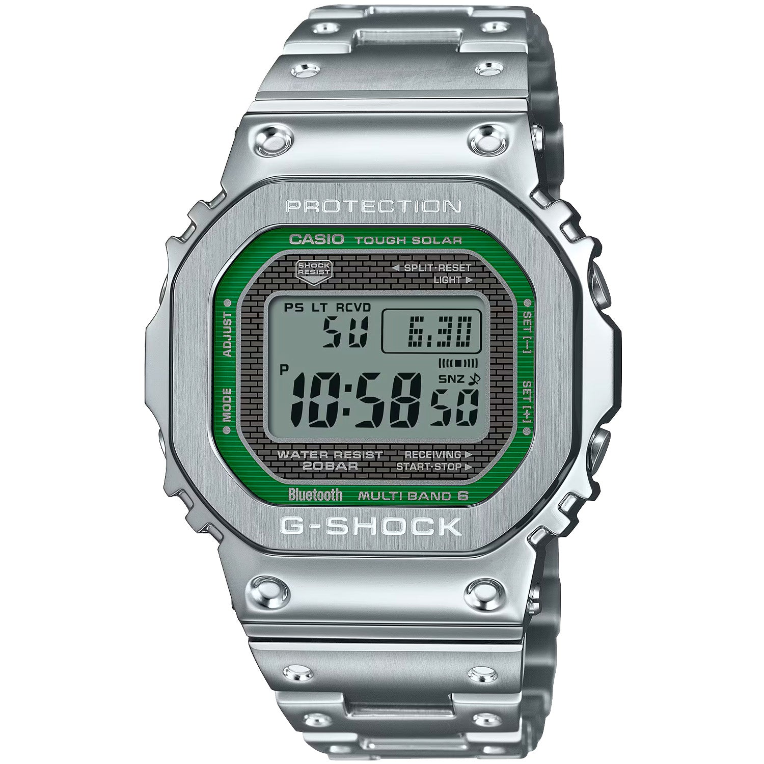 The time mode display layout carries on the look of the first-ever G-SHOCK, with traditional styling taking on advanced functionality. Download the CASIO WATCHES app to pair with your smartphone via Bluetooth®. With Multiband 6, Tough Solar charging system, and high-brightness LED light, you have complete practical utility at your fingertips.