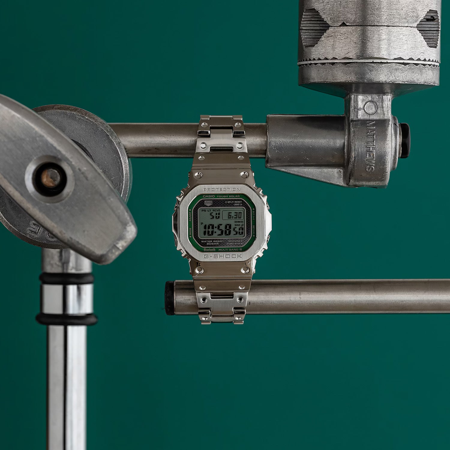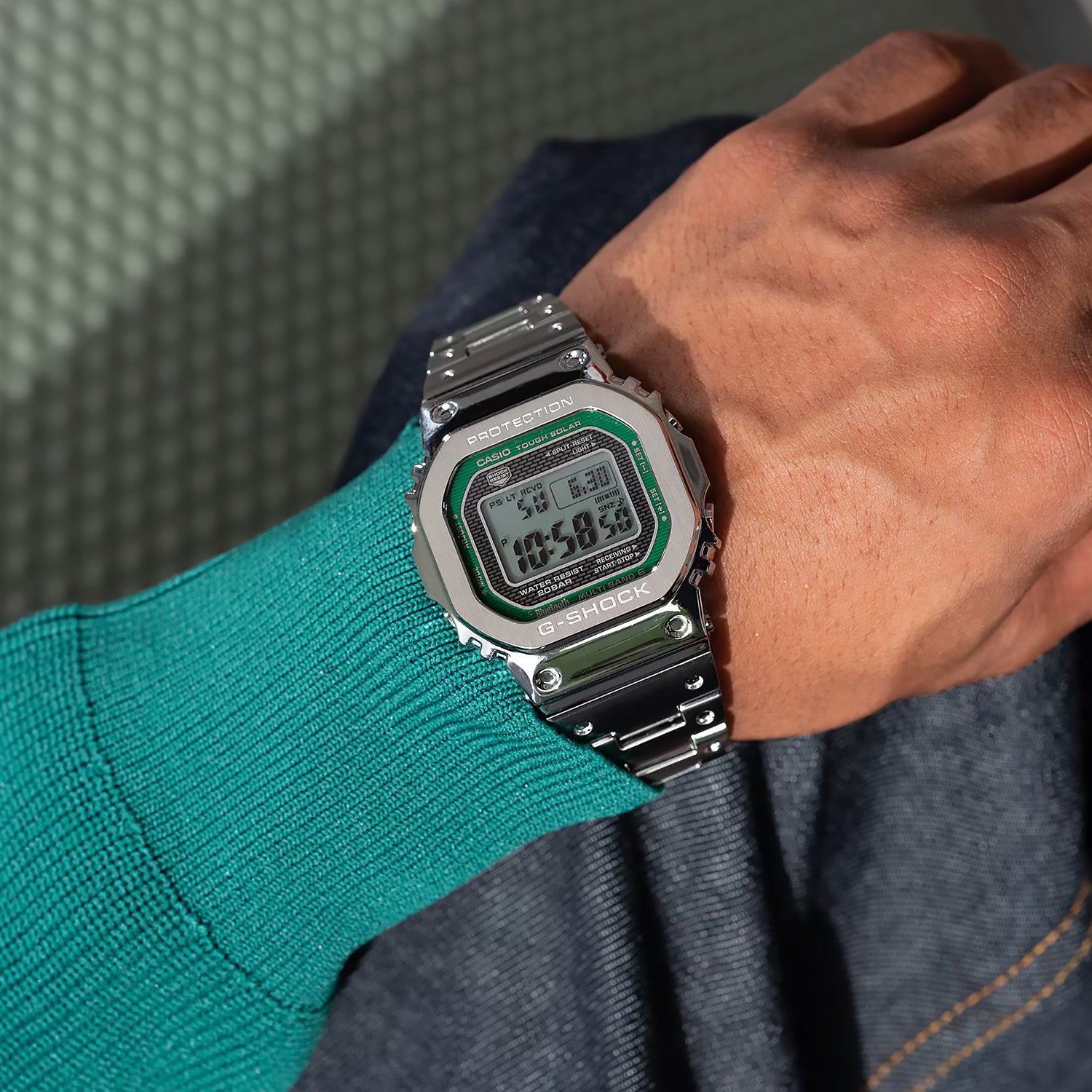 We kept the iconic form of the original G-SHOCK, while developing a new structure that extends the case all the way to the lugs to even further mitigate shock transmission. The intricate, modern shape, seen from the side, highlights the design’s structural beauty. An internal protector made of resilient resin temporarily deforms to absorb shocks, achieving a timepiece with a full-metal exterior that meets G-SHOCK shock-resistance standards. The stainless-steel case employs a screw-lock case back to ensure a tight seal.