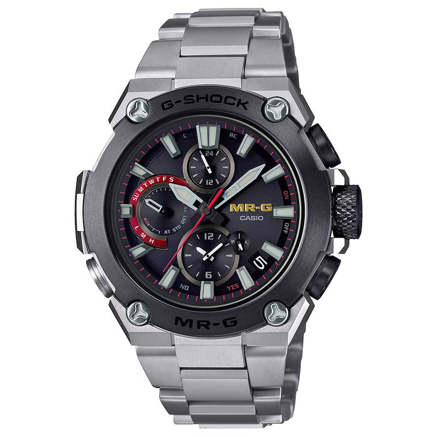 Casio's MR-G collection introduces the Titanium Edition MRGB1000D-1A mid-size model. The timepiece is a display of Japanese lacquer at its finest with gold/red accents. Made fully of metal, it includes patented Casio features such as shock-resistance and Bluetooth® radio-controlled solar-powered timekeeping.