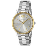 The G-Timeless line continues to define the latest collections, highlighting the signature motifs of the House. Presented with a quartz movement, the accessory features a stainless steel bracelet enriched with a silver-toned dial. The emblematic Interlocking G adds a soft logo touch to the piece.