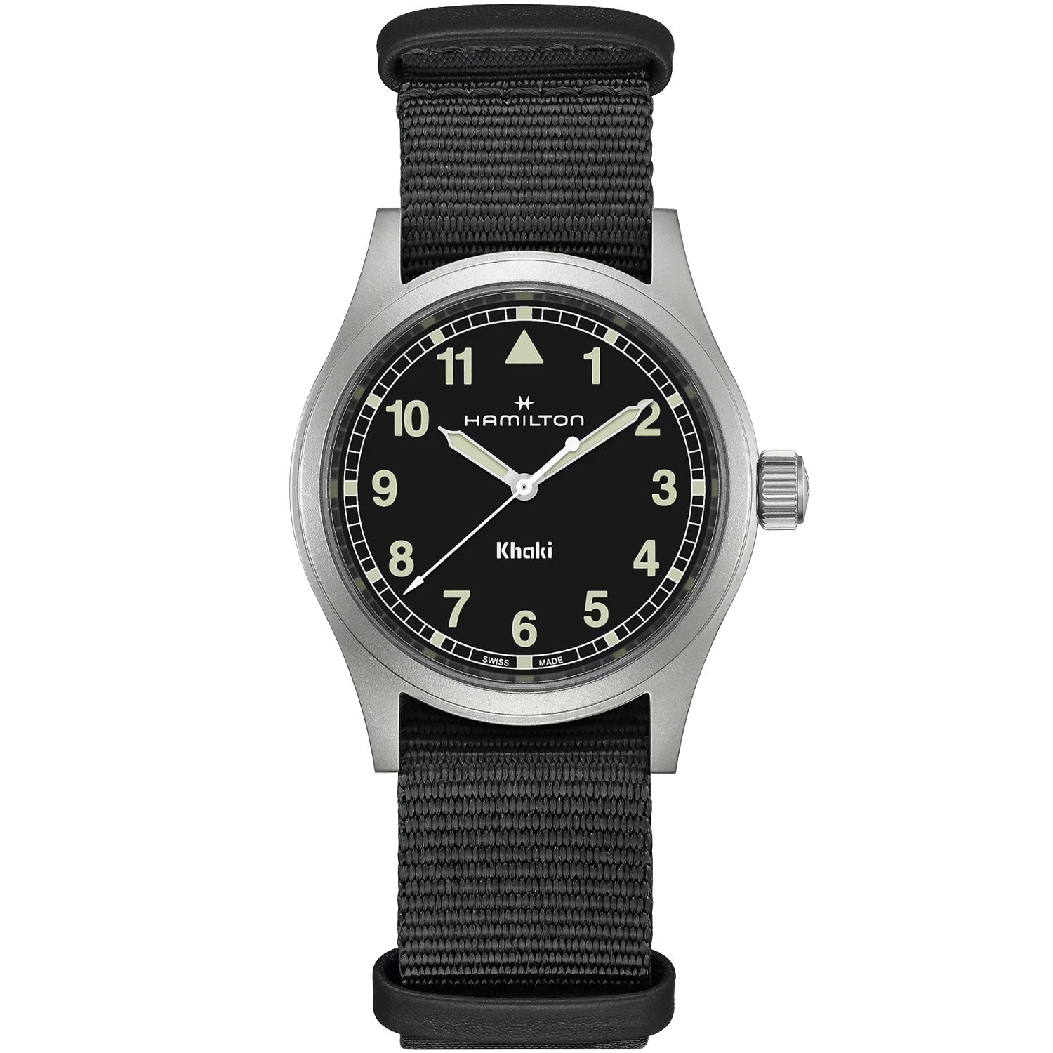 The Khaki Field Quartz expresses a return to Hamilton's military heritage through simplicity in design. The dial features a clear typography with straighter Arabic numerals and a "railway" minute track. The color palette is understated, with its sleek black dial highlighted by light green Super-LumiNova® indexes. The watch comes with a black textile NATO strap and black leather loops - perfect for your next adventure out in the field.