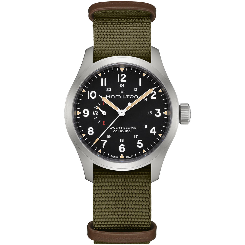 The Khaki Field Mechanical Power Reserve 40mm honors the heritage design and essential functionality of the Khaki family, while introducing modern features and the latest in watchmaking technology and innovation. With a new manual-winding H-23 movement, developed by ETA exclusively for Hamilton, it allows (for the first time) for the 80-hour power reserve to be visualized directly on the dial. Fitted with a rugged khaki green NATO strap, the black dial proudly displays "power reserve 80 hours" and shows "F" for full and "E" for empty, to underscore this exceptional and utility-focused feature.