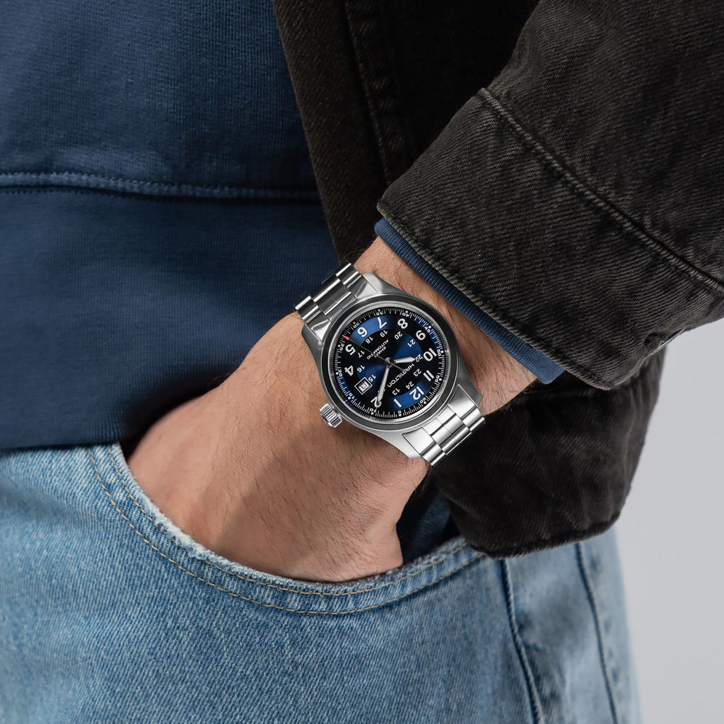 Inspired by the original soldiers' watch, the Khaki Field Automatic blends military heritage with contemporary design and offers versatility for modern pioneers. Pairing a navy sunray dial with a snailing effect on the hour ring, the dial reflects light whilst boasting texture and depth. Designed for action and built for adventure, the exclusive H-10 automatic caliber offers up to 80 hours of power reserve, ensuring it won't let you down. Discover our Khaki Field collection.