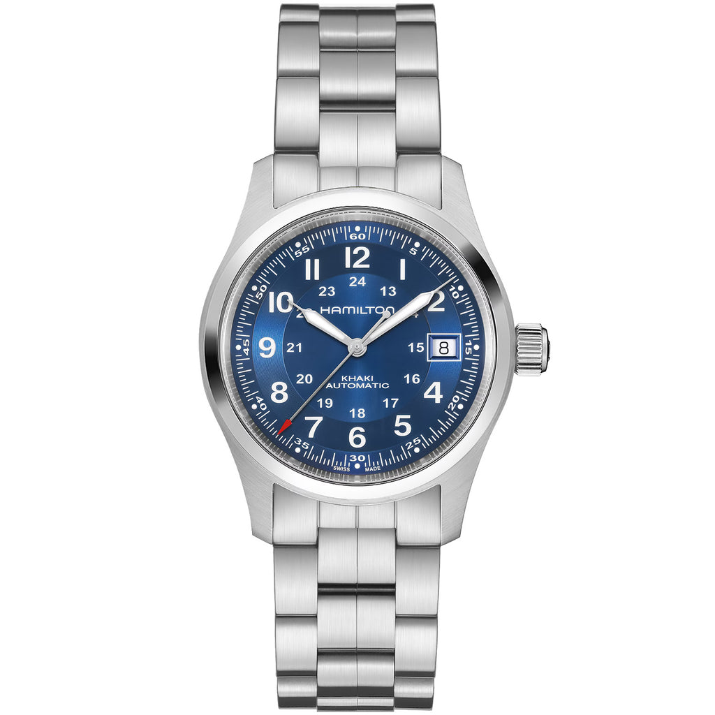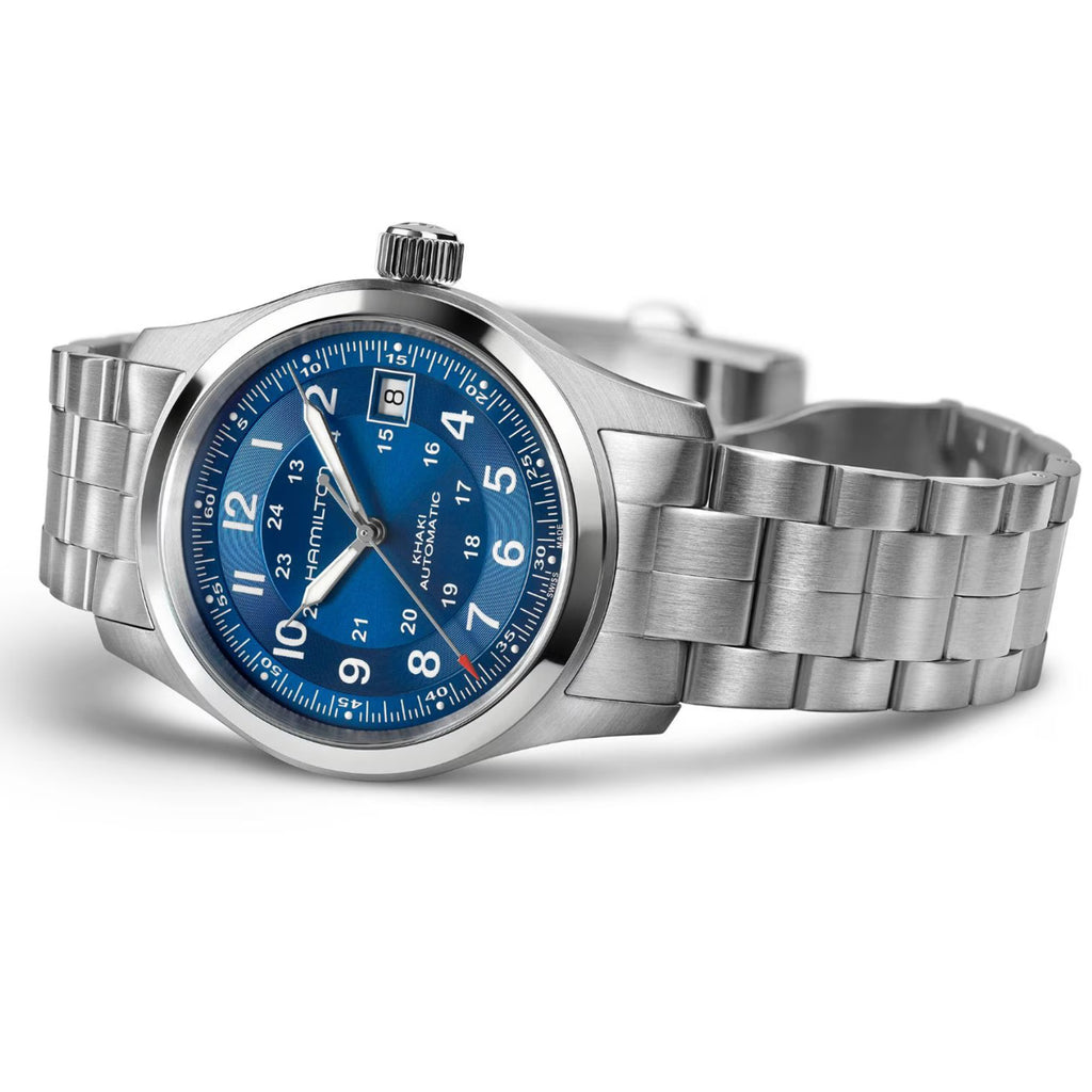 Inspired by the original soldiers' watch, the Khaki Field Automatic blends military heritage with contemporary design and offers versatility for modern pioneers. Pairing a navy sunray dial with a snailing effect on the hour ring, the dial reflects light whilst boasting texture and depth. Designed for action and built for adventure, the exclusive H-10 automatic caliber offers up to 80 hours of power reserve, ensuring it won't let you down. Discover our Khaki Field collection.