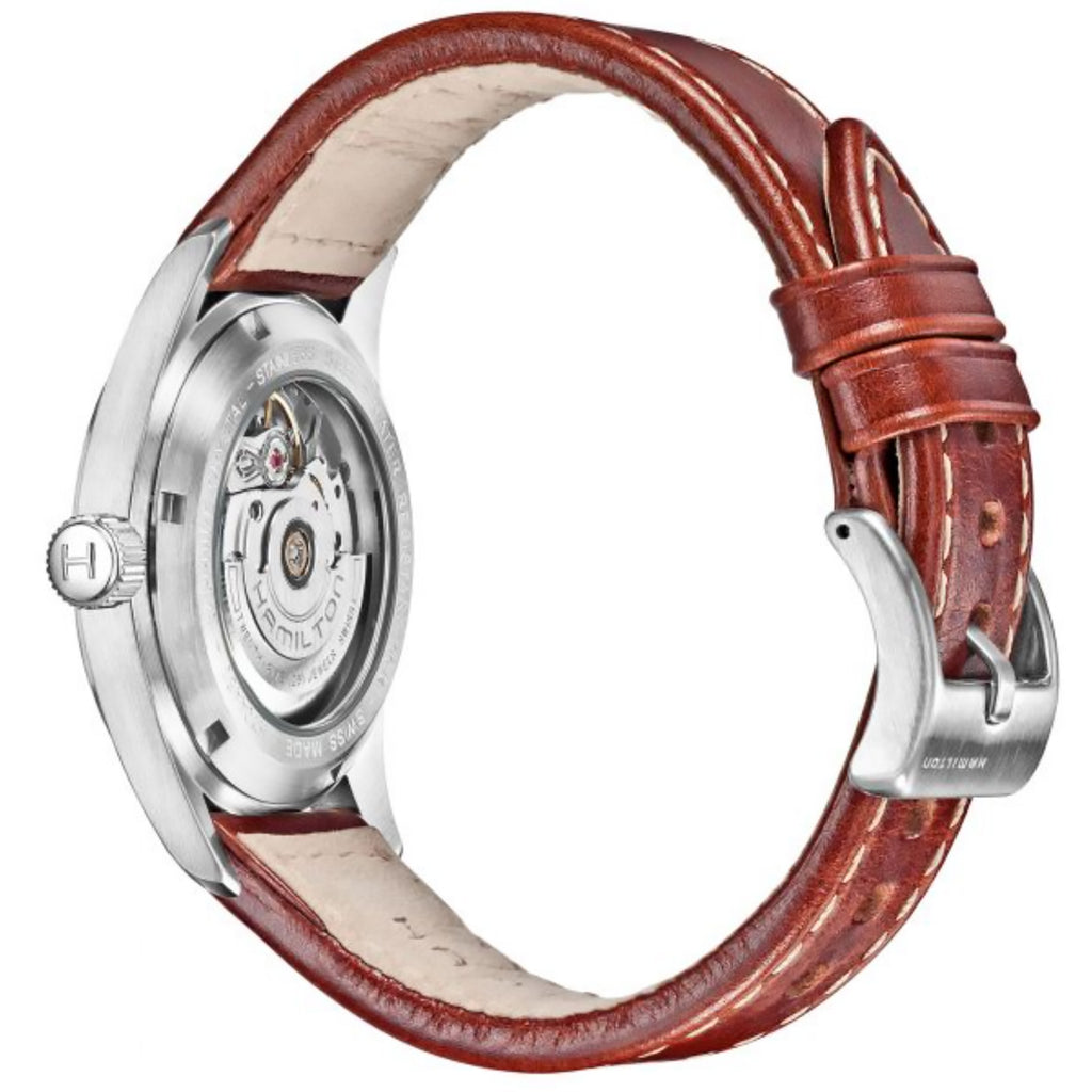 A three-hand movement with or without a date function and boasting a superior power reserve of 80 hours, the H-10 appears with intricate contrasting snail and pearled patterns for the American Classic models it drives and streamlined surfaces for the pilots’ watches.