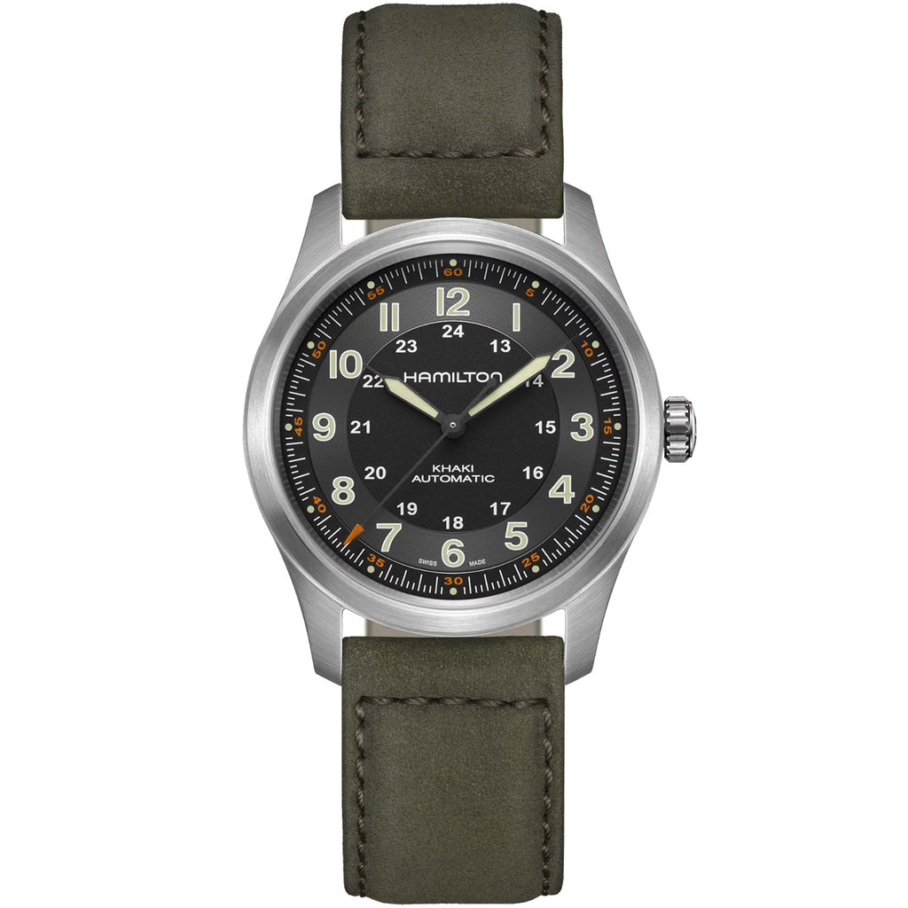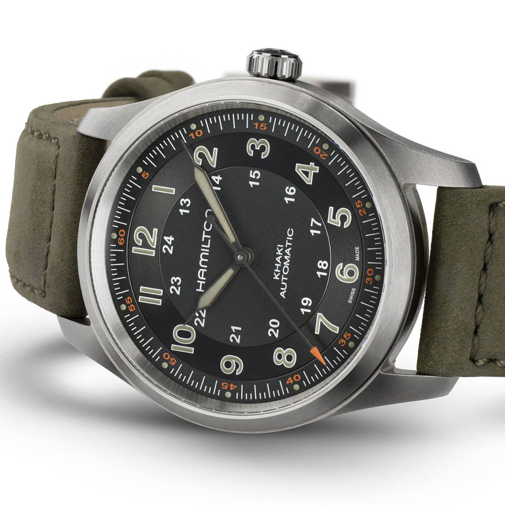 A century-long pedigree in military timepieces combined with lightweight materials make the Khaki Field Titanium Automatic the ultimate all-purpose watch for modern heroes. Truly fit for life in the field, the 38 mm case size accentuates comfort and adaptability with a historically authentic design.