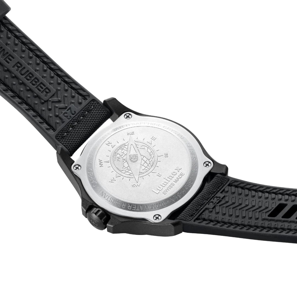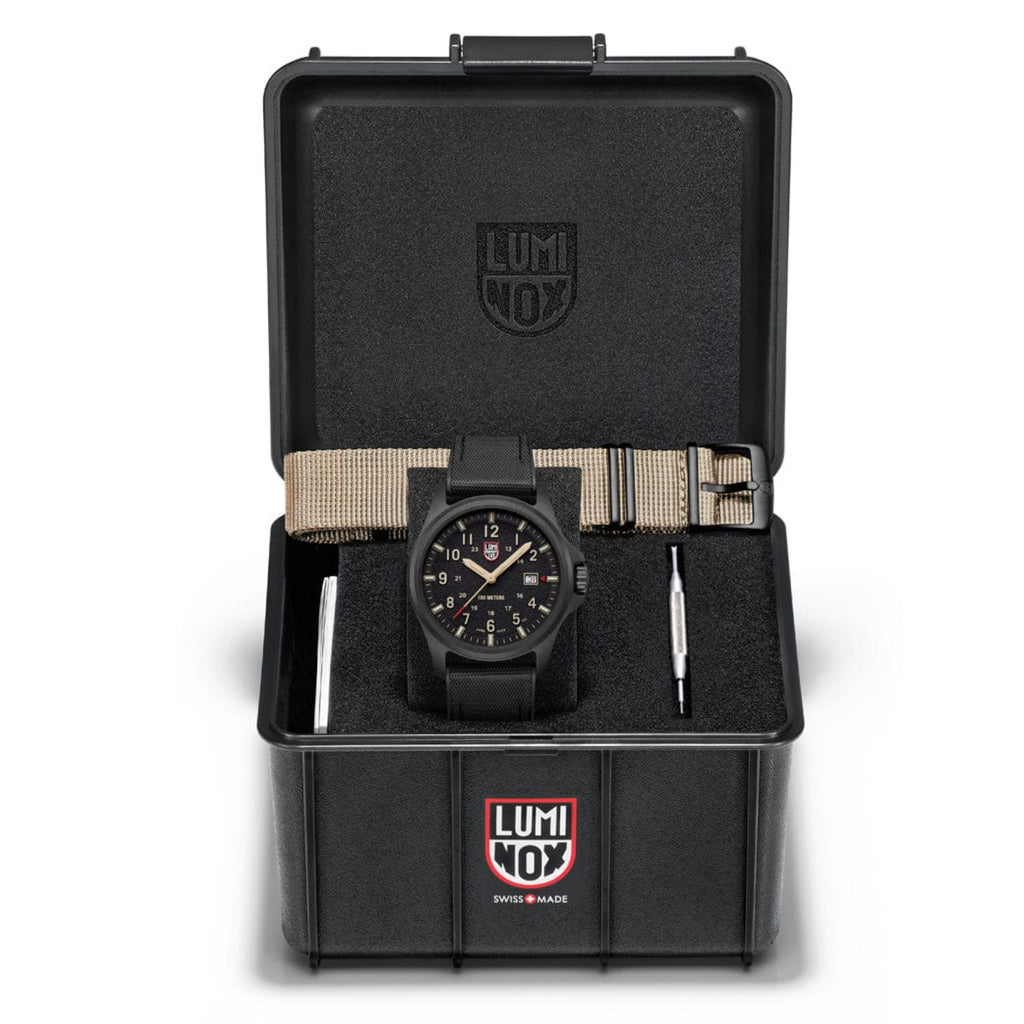 This Atacama Field 1970 watch is inspired by its namesake, the Atacama Desert. The design with a black dial with textured finish and sand hour numbers evokes the terrain and rugged landscape of the desert. The timepiece presents a large dial that displays the 12- & 24-hour clock, along with a red tipped second hand and red arrow next to the date at 3 o’clock for instant readability. The dial is protected by sapphire crystal with anti-reflective coating. The 43 mm CARBONOX™ case is matched with a black rubber strap that can also be swapped with the additional second strap that comes with the watch, a sand webbing NATO strap.