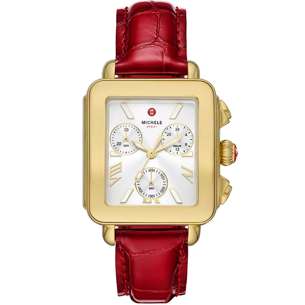 This 18K gold-plated Deco Sport offers a sporty, more casual take on the classic Deco with a gold-tone topring, gold-plated case, lum-filled stick indexes and ruby red croco-pattern leather strap.