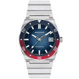 This 39 mm stainless steel watch is driven by a precision Swiss automatic movement and features a blue and red split aluminum bezel, a blue gradient dial, Swiss Super-LumiNova® accents, date window detailing, and an exhibition case-back.