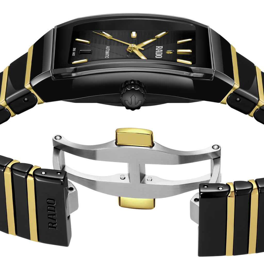 Crafted from polished black high-tech ceramic links and polished yellow gold colored PVD coated stainless steel middle links, the bracelet is meticulously secured by a brushed stainless steel 3-fold clasp. Beneath this distinctive crystal lies a black lacquered dial revealing a striking pattern of irregularly spaced horizontal lines.