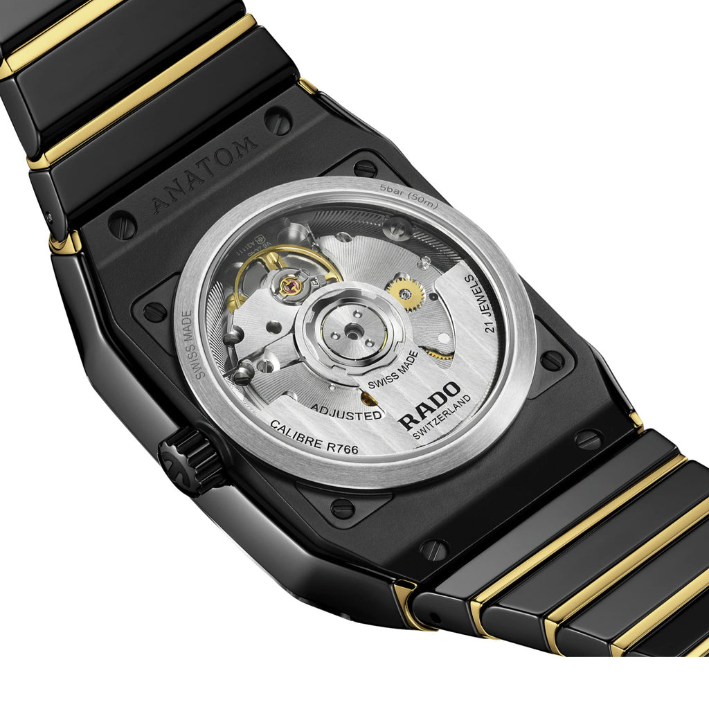 Yellow gold-coloured applied hands and indexes with coated white Super LumiNova® create a refined contrast against the dial’s depth. Crowning the dial at 12 o’clock is the iconic moving anchor, complemented by a discreet date window positioned at 6 o’clock. Beating at its heart, and exalted through the sapphire crystal caseback, is the 21-jewels Automatic R766 calibre. Finely regulated in five positions & equipped with a Nivachron™ hairspring, this movement delivers a high level of accuracy and a robust 72-hour power reserve, underlining Rado's commitment to perfection.