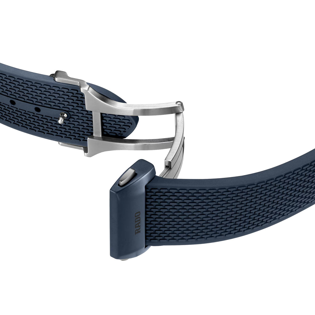 Thanks to a matching navy blue rubber strap and the high-tech ceramic buckle cover, this new Captain Cook shows its sporty side.