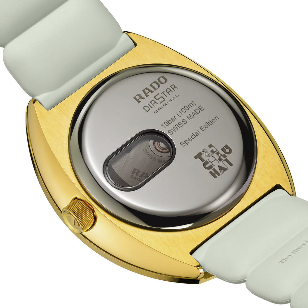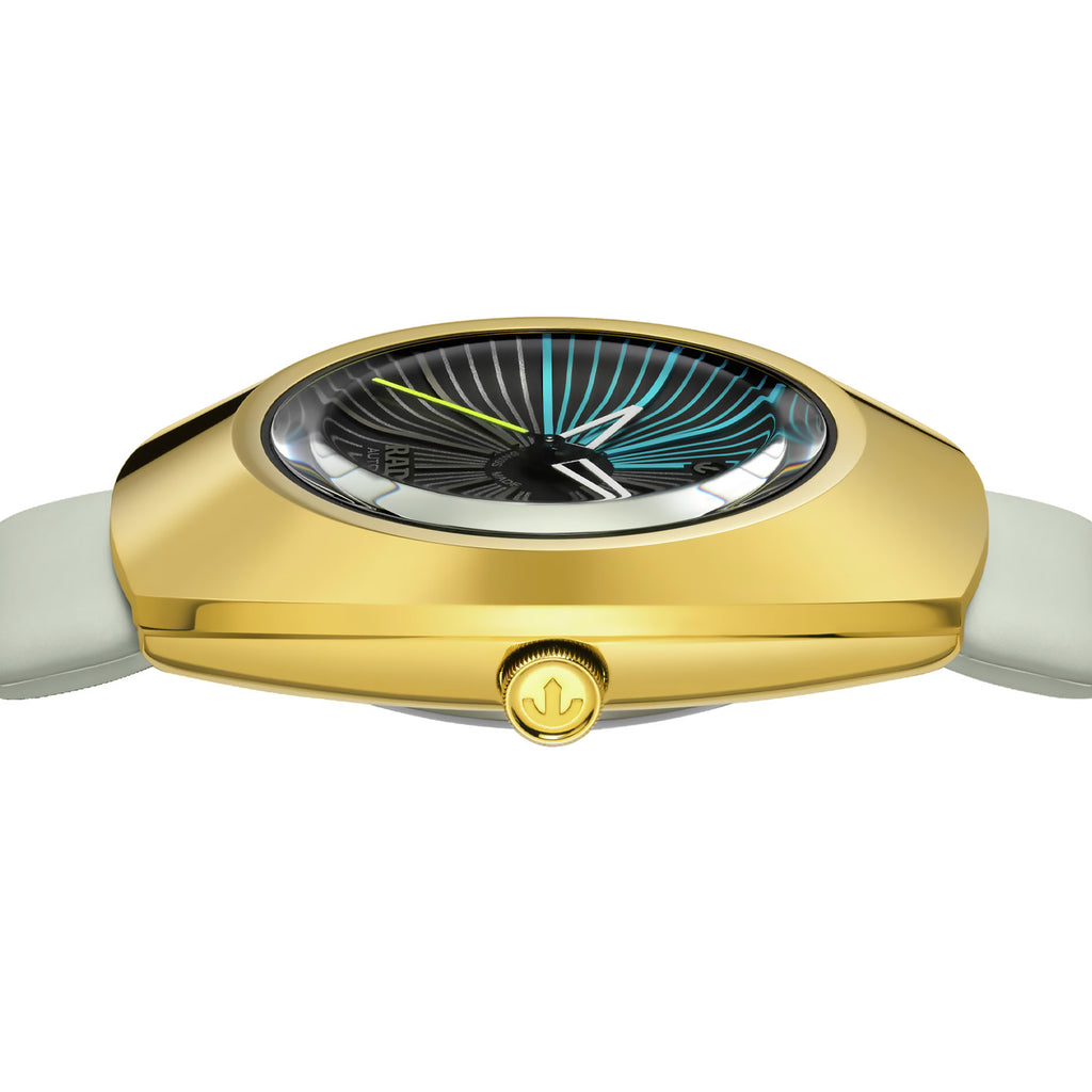 The 38 mm case, crowned by a polished yellow gold-colored PVD coated Ceramos™ bezel, merges effortlessly with a polished yellow gold-colored PVD coated stainless-steel middle case, offering water resistance up to 10 bar (100 meters). The matt black concave dial is a pure demonstration of Rado's technical detail mastery, with printed silver and blue minute tracks intersected by applied indexes in relief at five-minute intervals. At 12 and 6 o’clock, the iconic sandblasted black gold-colored moving anchor and the applied Rado logo stand proud, complemented by a day and date guichet at 3 o’clock, featuring Tej Chauhan’s proprietary font in a vibrant and colorful palette, including neon paint. Polished black and gold-colored hour and minute hands with white Super-LumiNova® and a neon yellow-accented second hand ensure impeccable legibility in any light. The ultra-sophisticated display is safeguarded by a radial-faceted sapphire crystal, enhanced with an anti-reflective inner coating. Powering this time machine is the automatic R764 calibre. Finely regulated in five positions and equipped with a Nivachron™ hairspring, this movement delivers a high level of accuracy and 80-hour power reserve. Completing the ensemble, a radical grey, pillow-shaped rubber strap is secured by a dark grey PVD-coated stainless steel extendable folding clasp, topped with a yellow gold-colored cover and pushers engraved with Rado x TC inscriptions.