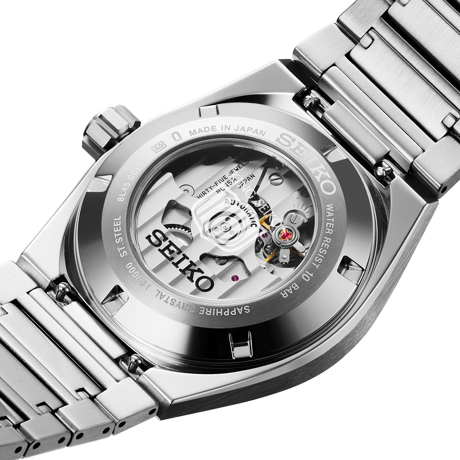 A screwdown see-through caseback, and a crown adorned with the King Seiko crest. Crafted of stainless steel, with the combination of mirror and hairline finishing characteristic of the original King Seiko models, this exceptional timepiece includes a bracelet with two levers on the endpiece that can be pressed for easy removal and a deployment clasp with push button release. 100 meter Water Resistant