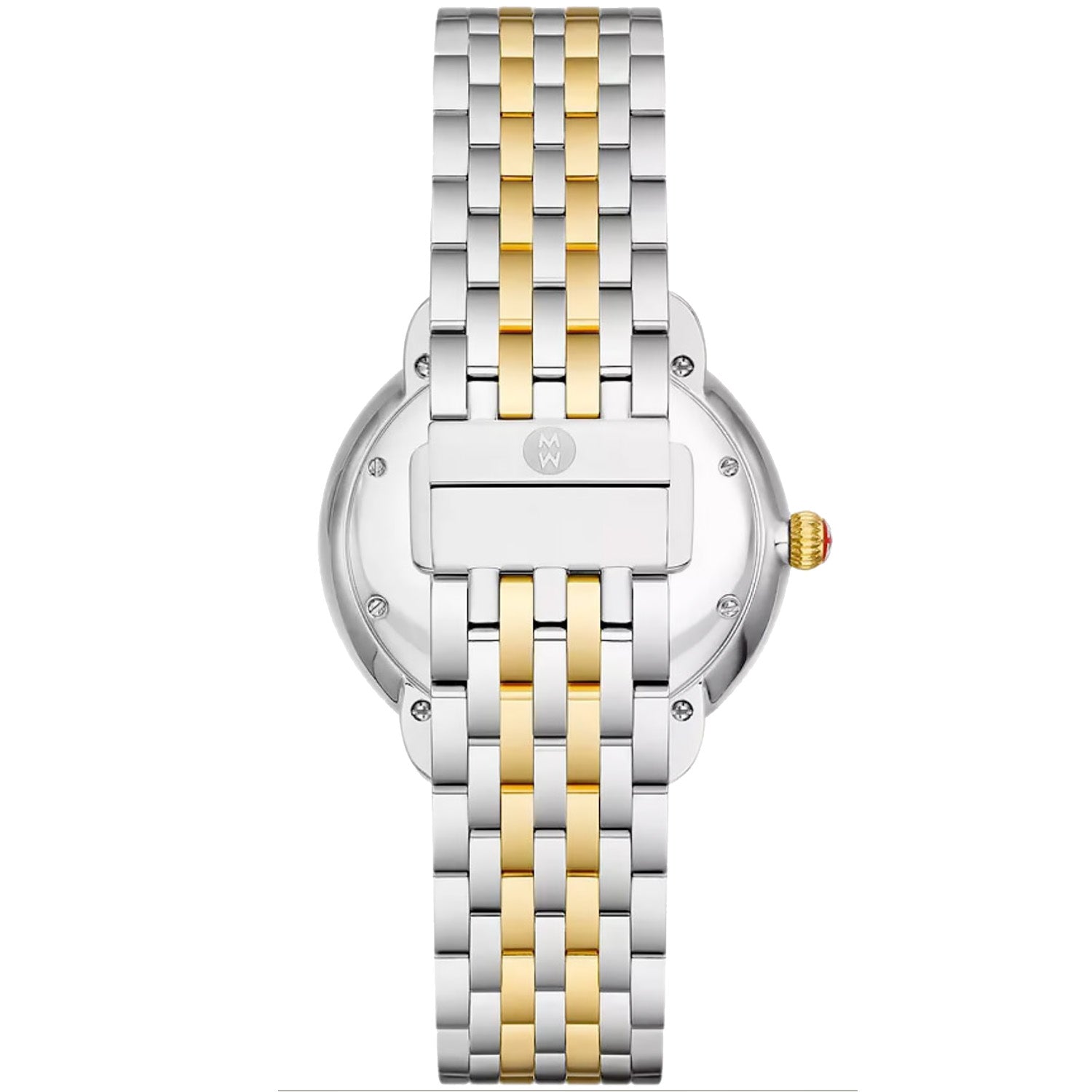 Feminine, elegant and timeless, 134 hand-set diamonds adorn the 18K gold-plated and stainless-steel special edition Serein Mid timepiece. Roman numerals and the signature MICHELE logo grace the silver-white sun-ray dial. The two-tone bracelet is interchangeable with any 16 mm MICHELE strap.